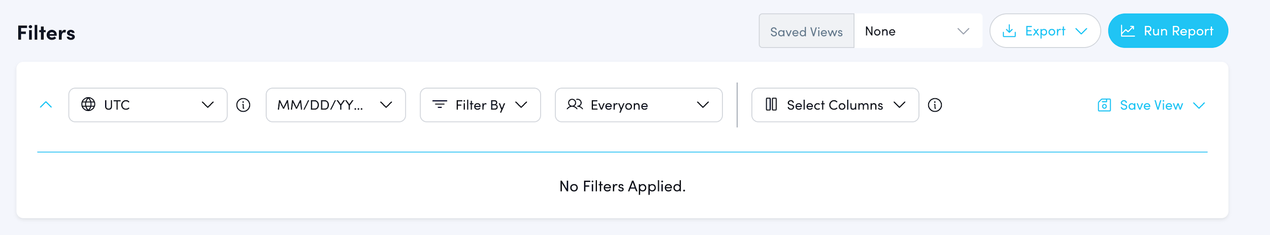Before running the report, apply filters to narrow down your data. Unselected filters default to “Select All.” Available filters include: