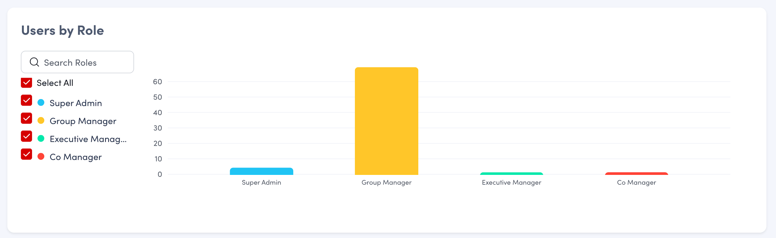 The bar graph below shows the distribution of users by role. The x-axis displays the name of each role and the y-axis shows the number of users. Use the check boxes to view data for only certain roles.