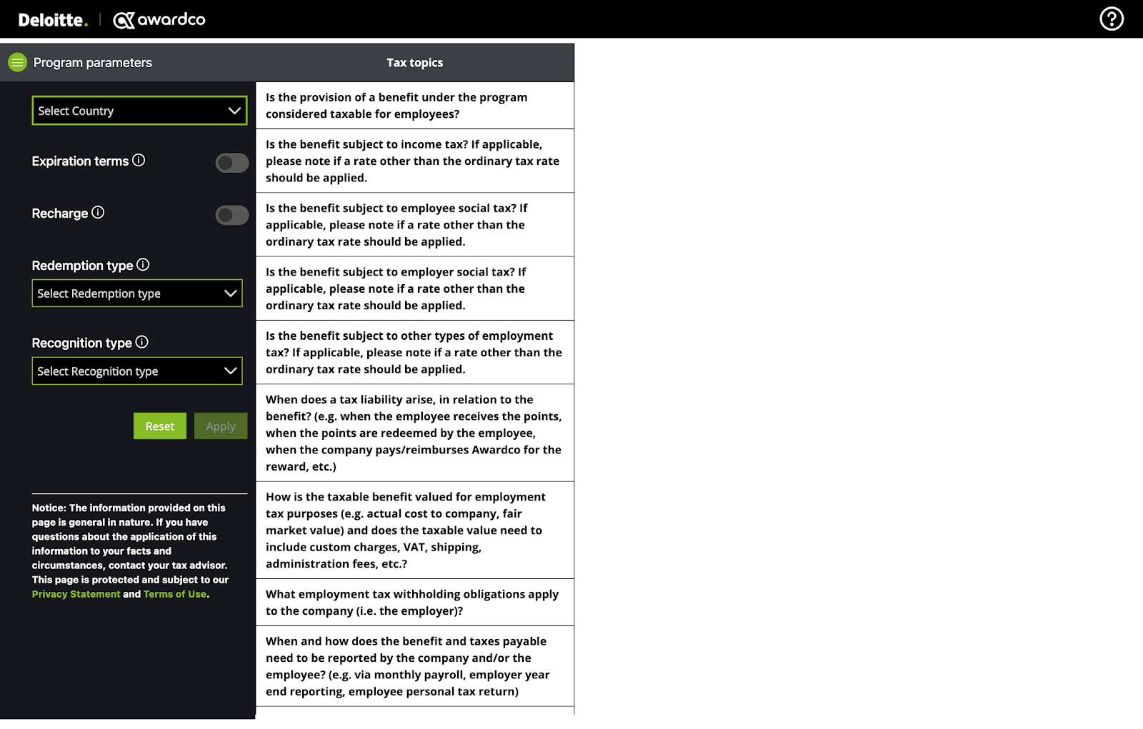 - Begin receiving tax guidance on rewards and recognition by selecting program parameters. Select the country or countries in which your organization operates, toggled the Expiration terms and Recharge options, if applicable, and select redemption and recognition types from the drop down menus.