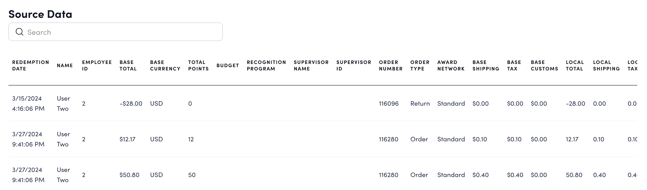 - Point Source: Filter by Recognition, AwardCode Claim, Return, Manual Balance Adjustment, Unknown (usually applies to older data), or Purchase Points at Recognition.