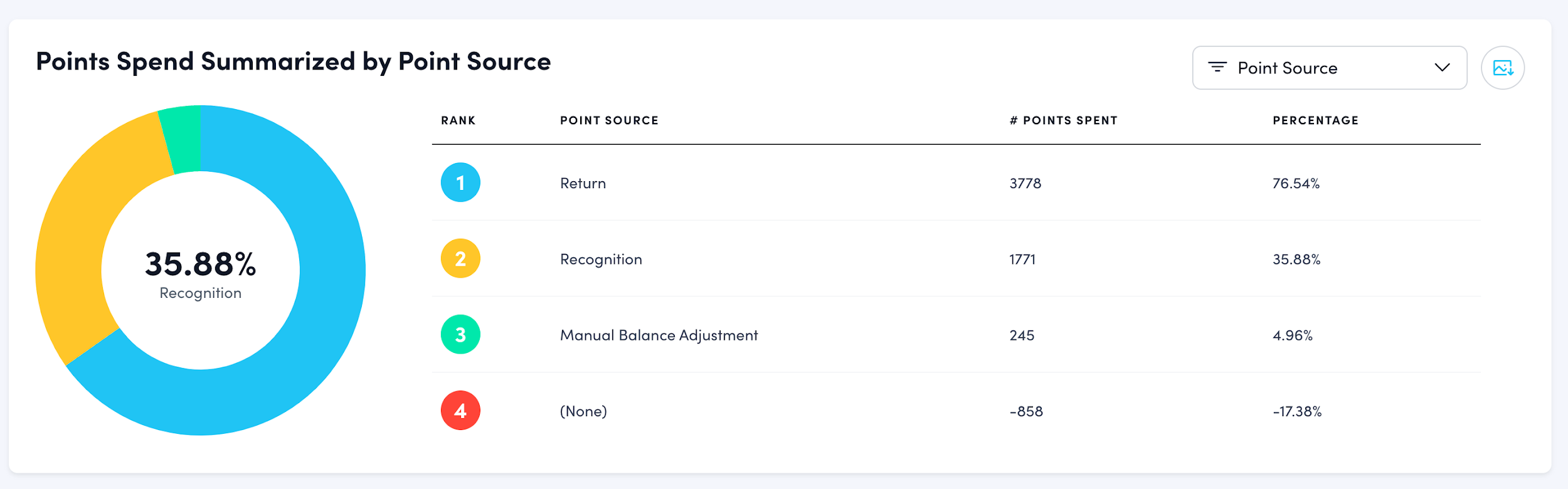 This section shows a pie chart that summarizes the points spent from different categories presented in the drop-down menu to the right of the graph title. The default view is "Point Source" which helps you see the number of points spent on recognition, points returned to employee wallets, points adjusted in user point balances etc. at a glance.