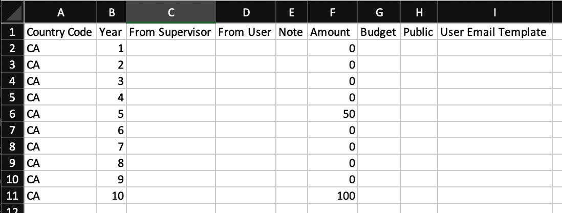 User Email Template - In this field, enter the name of the template that you would like to send to the employee celebrating the anniversary. The value entered here will need to match the name of the template exactly. While this field is not required, we recommend working with the Awardco team to build and utilize an email that will celebrate your employee. As discussed in the "Amount" section, we recommend sending an email to every user, including those who are not receiving a monetary amount. We firmly believe there is never a bad time to celebrate an employee's contributions to your organization, especially when they are celebrating the completion of another year with you.