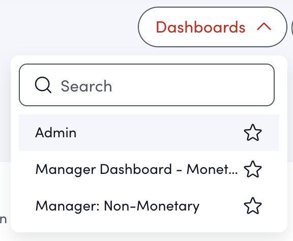 This view shows all dashboards across your organization. Click either "Admin Dashboards" or "Manager Dashboards" to view all active dashboards in that category and all roles eligible to view them.