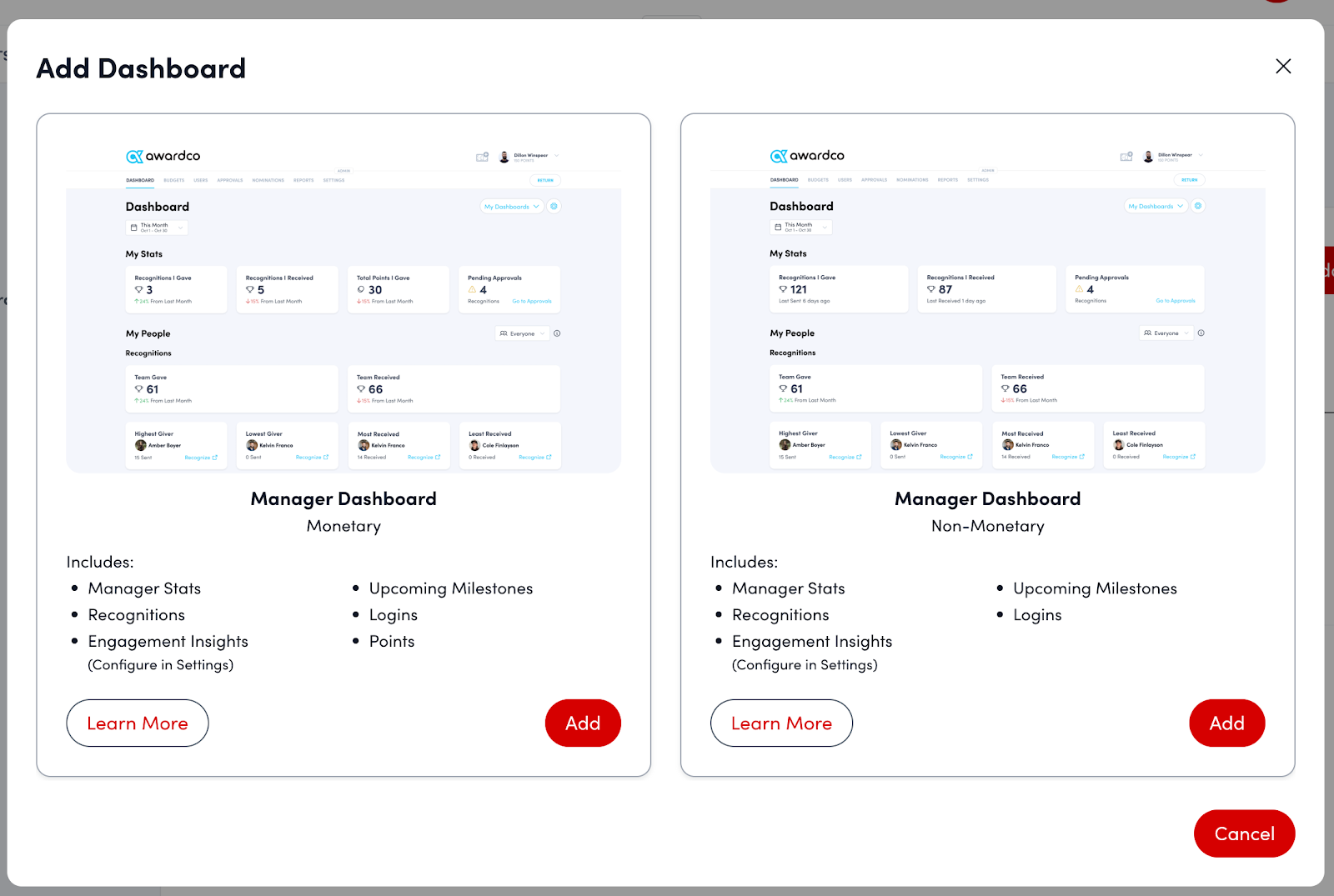 Dashboards under this tab give managers visibility into login, recognition, redemption metrics, and more for their direct reports.