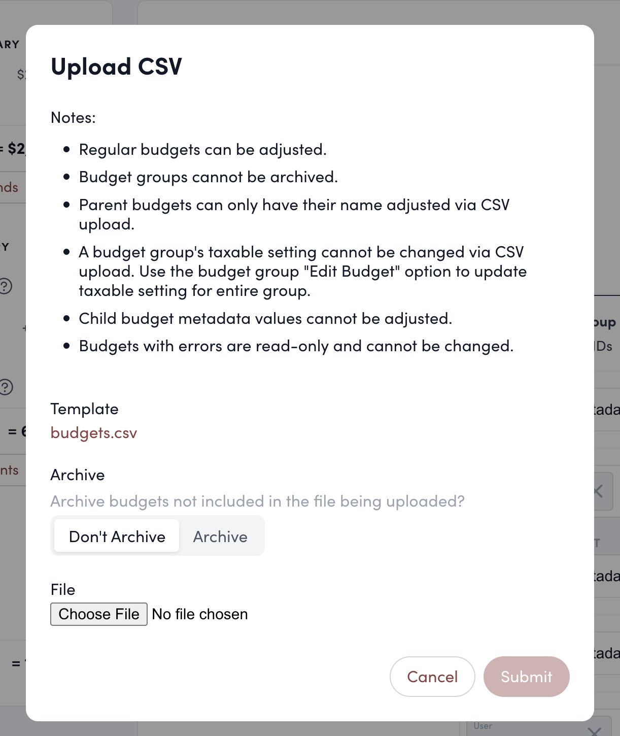 - Child budget metadata values cannot be adjusted via CSV upload.