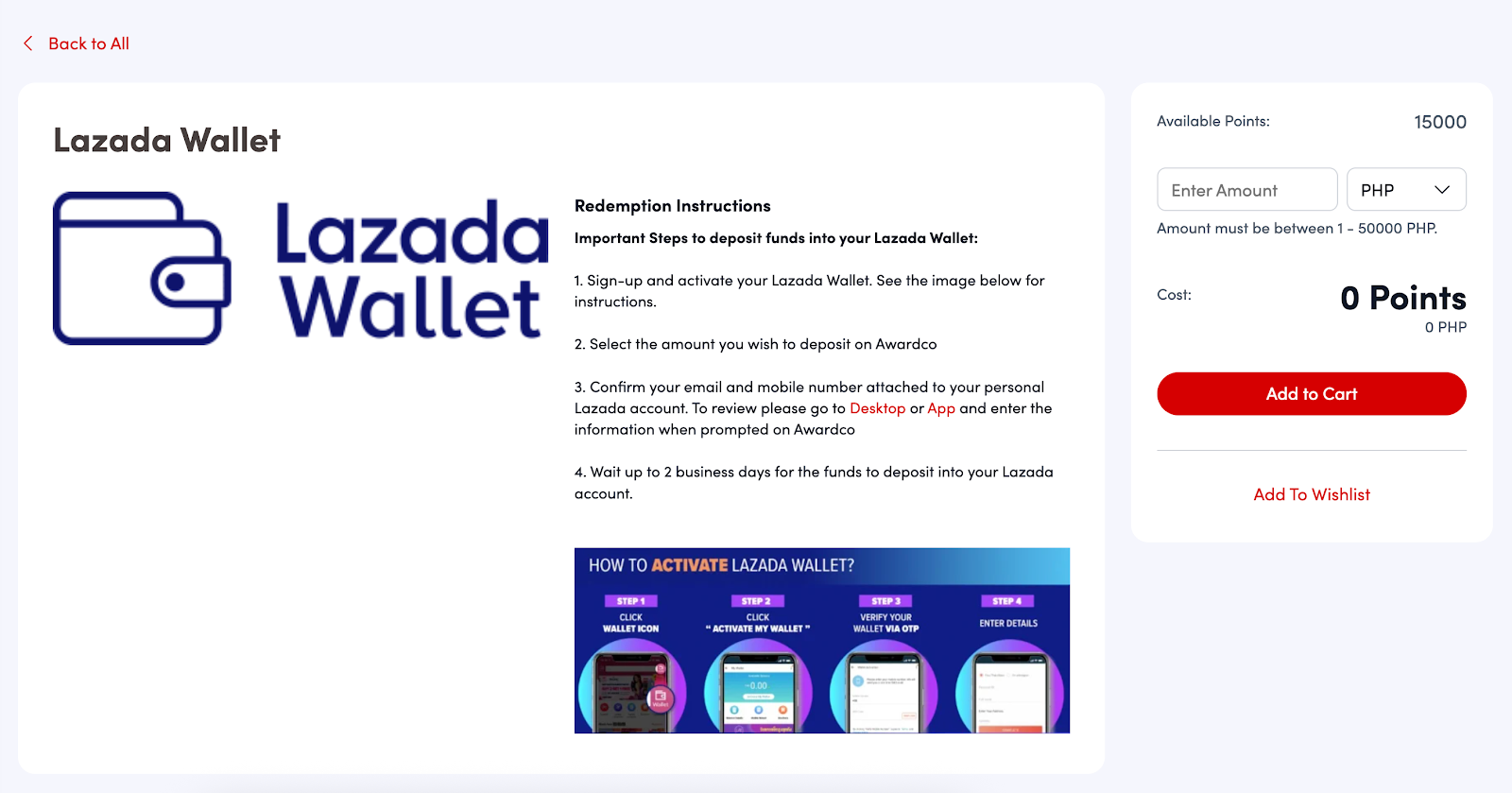 For users in the Philippines, activating Lazada Wallets allows employees to easily spend their reward points using a familiar payment method. Enabling your employees to spend their points within a comfortable and recognizable platform enhances their experience, leading to higher engagement and increased redemption rates.