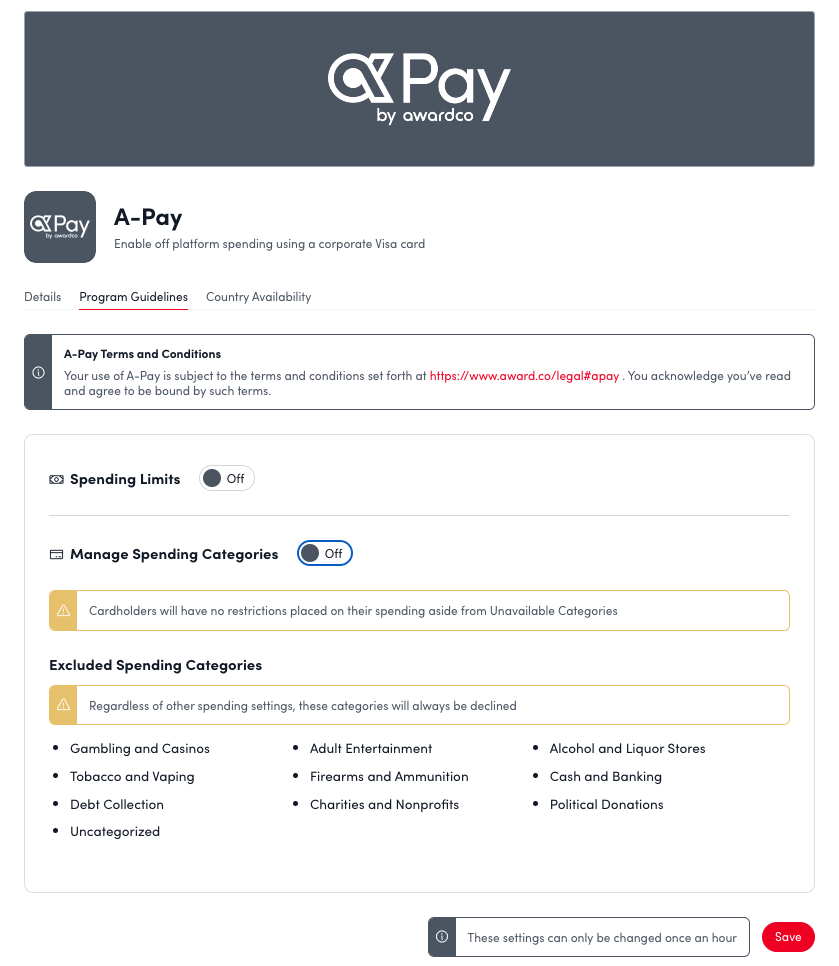 Edit spending settings to manage how users spend points awarded through A-Pay: