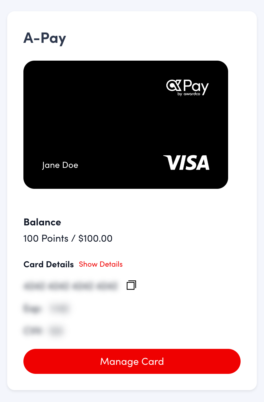 A-Pay is a virtual or physical card that connects directly to your Awardco point balance. It seamlessly complements our Lifestyle Spending Account feature, enhancing your ability, as an admin, to manage subscriptions and memberships. User card information is securely stored on the Awardco platform, ensuring privacy.