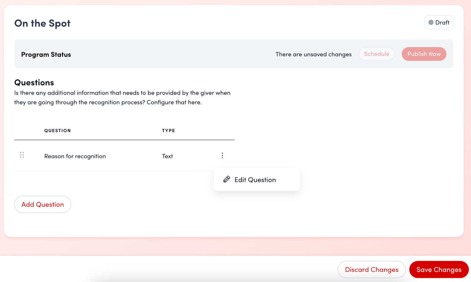 The default question is a free-form field that allows users to enter custom text. Click the three vertical dots to the right of the question to modify the question text. Enter your desired question text in the Question field and click Save Changes.