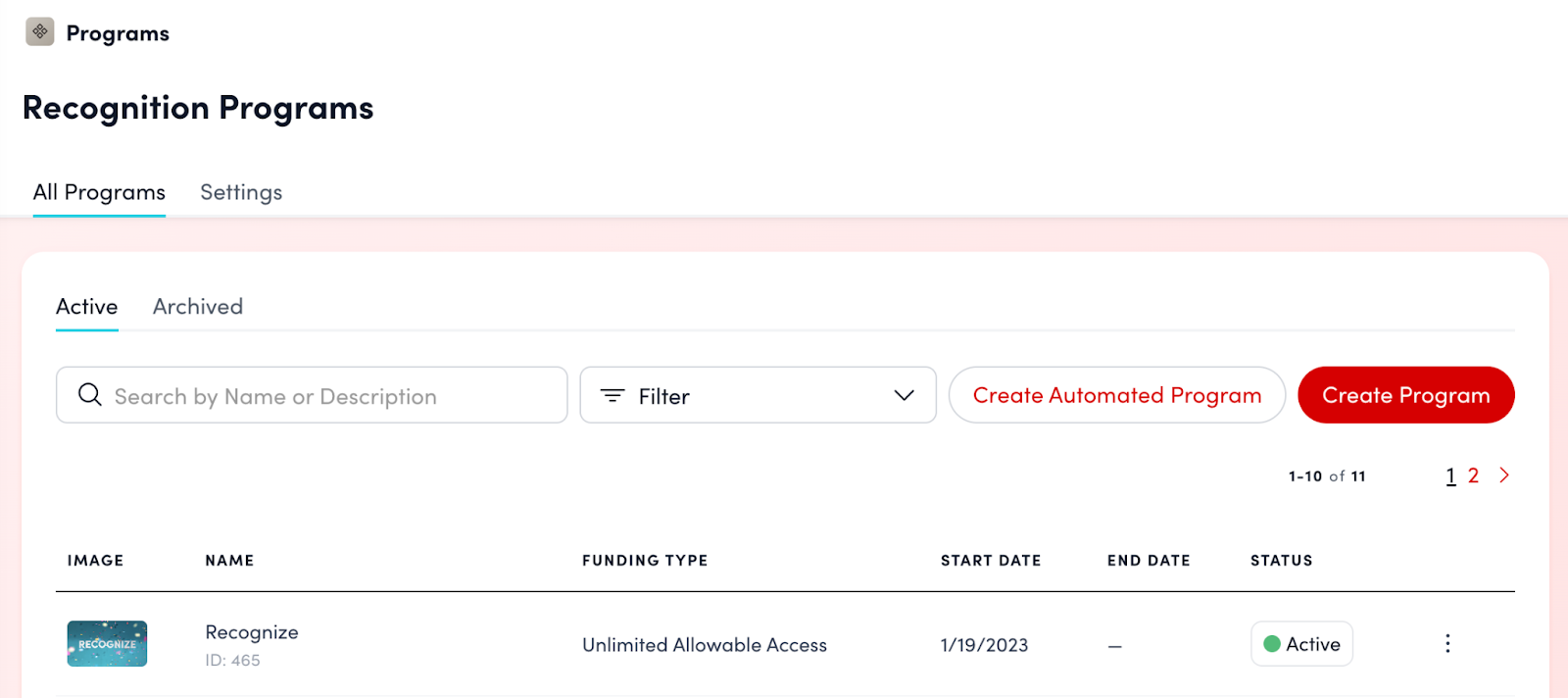 - From the left navigation, click “Recognition,” then “Programs,” then “Recognition Programs” menu to bring you directly to Recognition Program Settings.