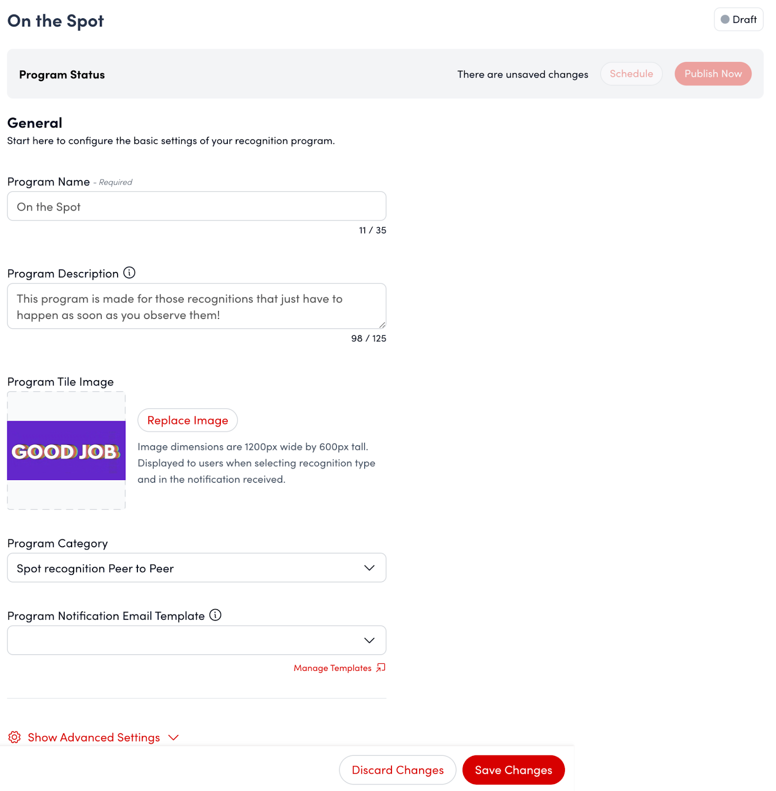 To make the program "active" or "live," select either Publish Now or Schedule, located at the top of the program settings page. Publish Now will activate the program immediately upon selection. Schedule allows you to set a specific date and time in the future for program activation.