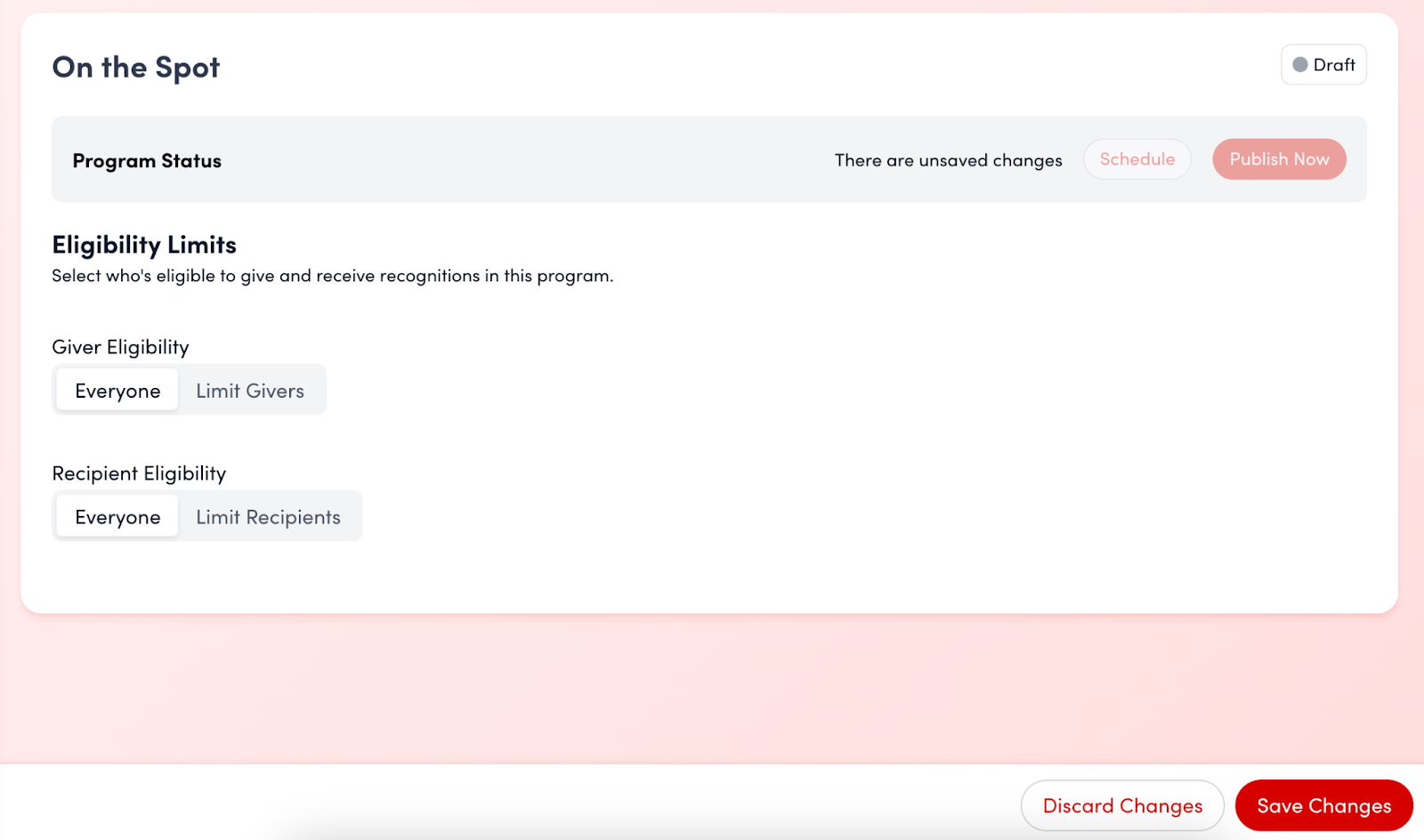 Toggle both Giver and Recipient eligibility to Everyone. If you wish to restrict nominators and recipients to specific groups within your organization, toggle Limit Givers and/or Limit Recipients, and select the relevant users or metadata values.