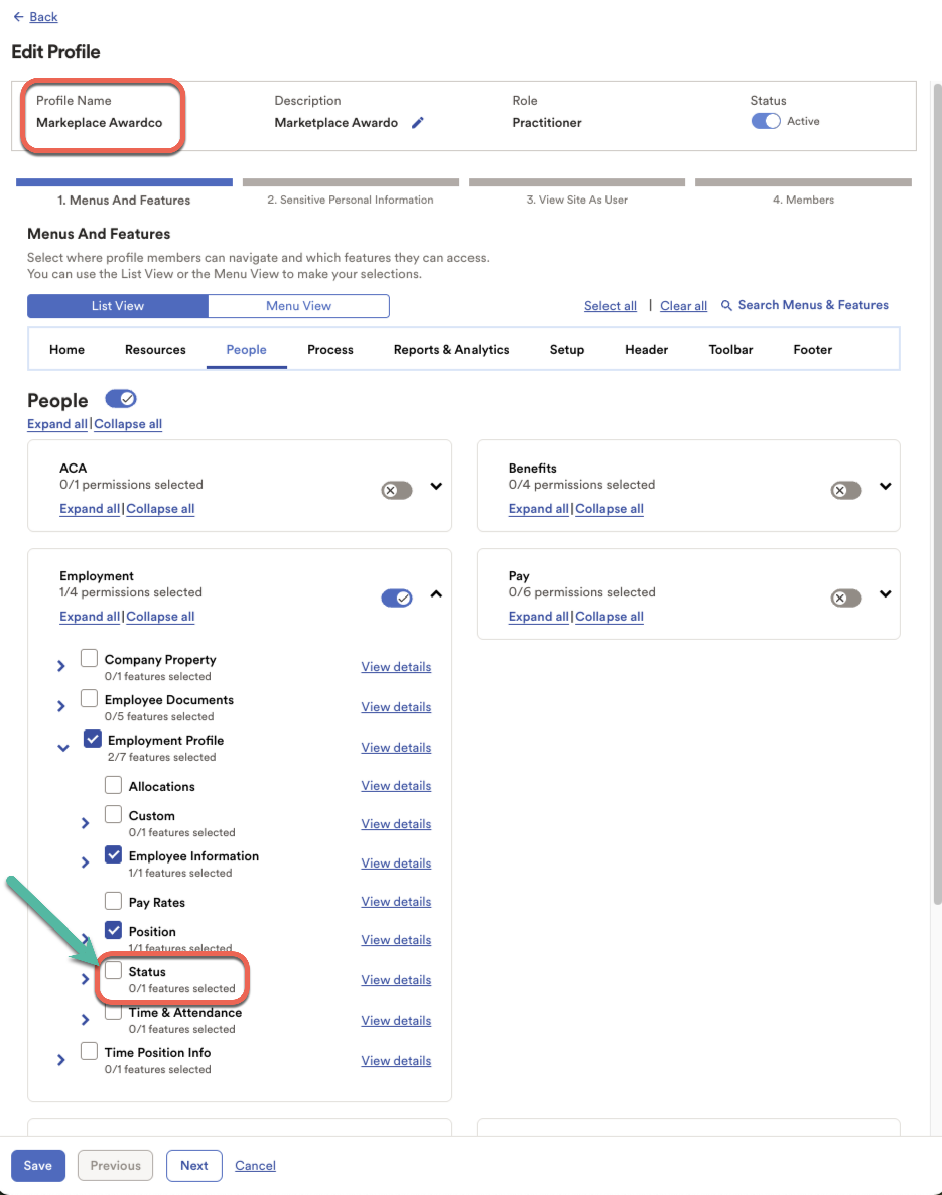 A: The integration filters out users who don’t have an active status in ADP. You’ll need to enable the ‘Status’ permission in your custom Marketplace Awardco Profile in ADP so that the integration knows who is active and who is not. If the permission is not enabled, no employees will register as active and no user data will be sent.