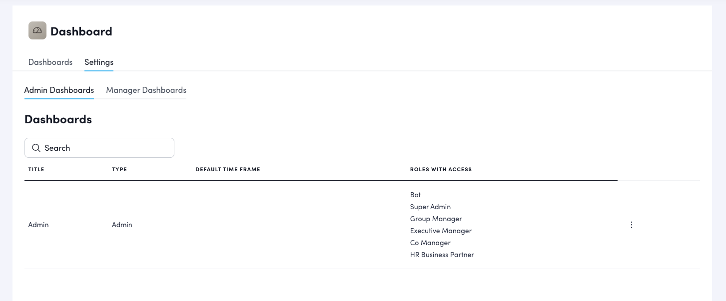 This view shows all dashboards across your organization. Click either "Admin Dashboards" or "Manager Dashboards" to view all active dashboards in that category and all roles eligible to view them.