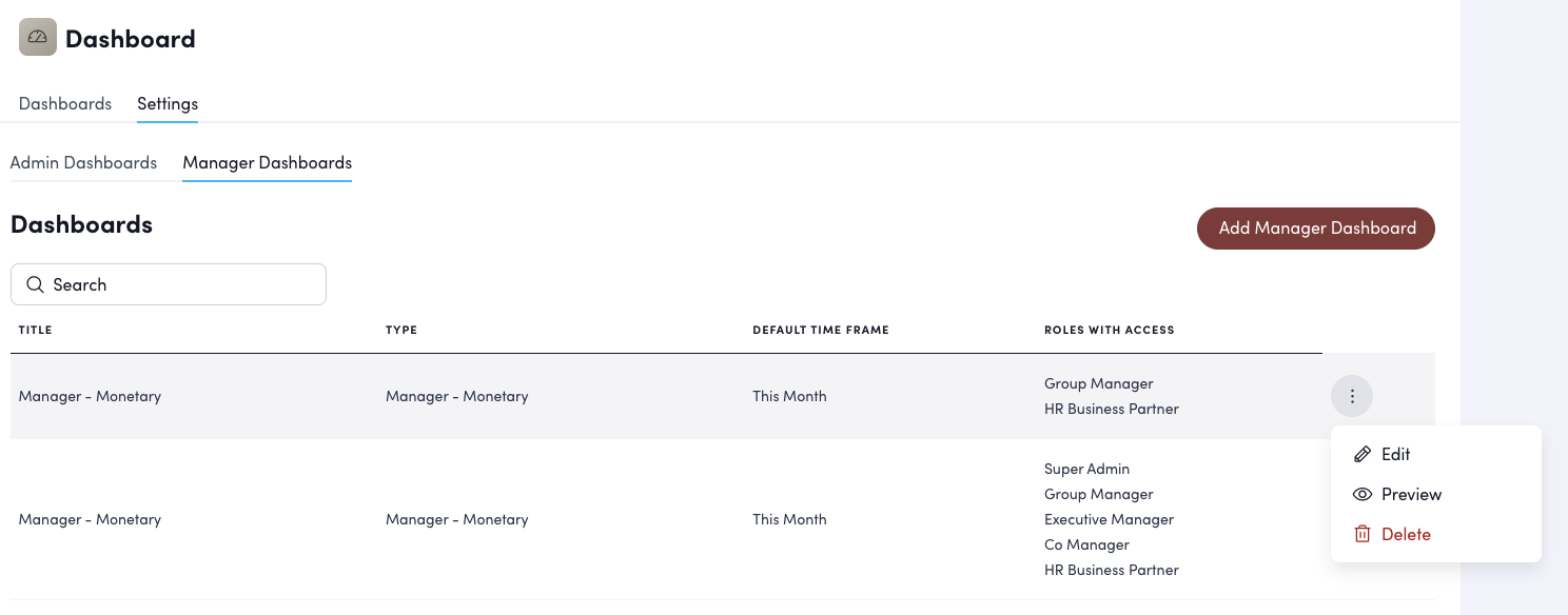 To modify role access, preview a dashboard, or delete it, click the three-dot menu next to any dashboard.
