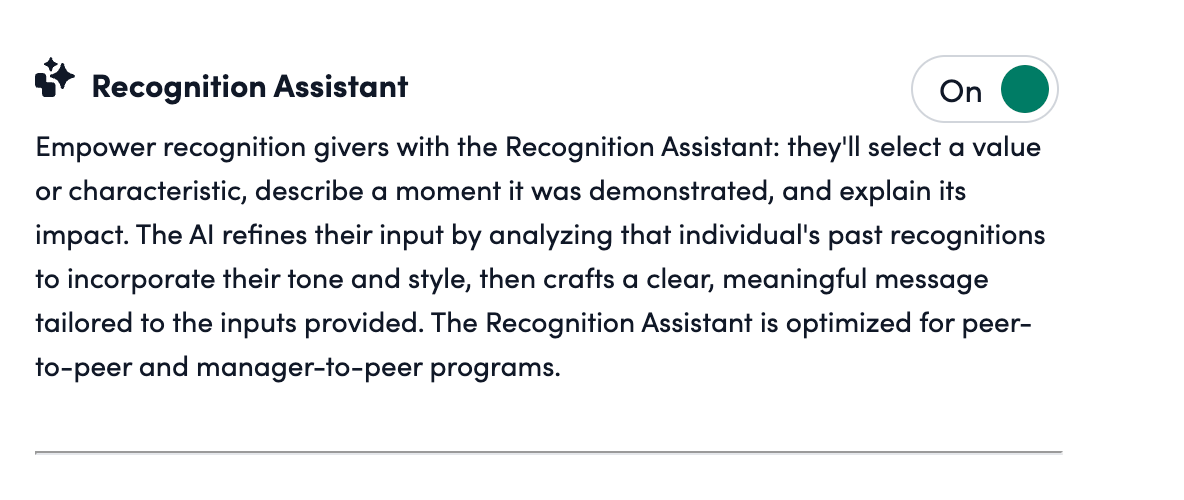 The AI Recognition Assistant will now be available for users submitting recognitions through this specific program.