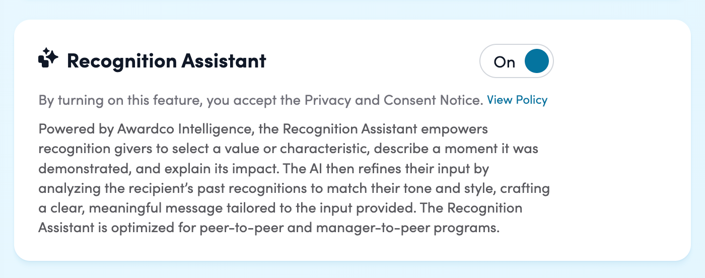 Once accepted, the AI Recognition Assistant is ready to be added to your individual recognition programs.