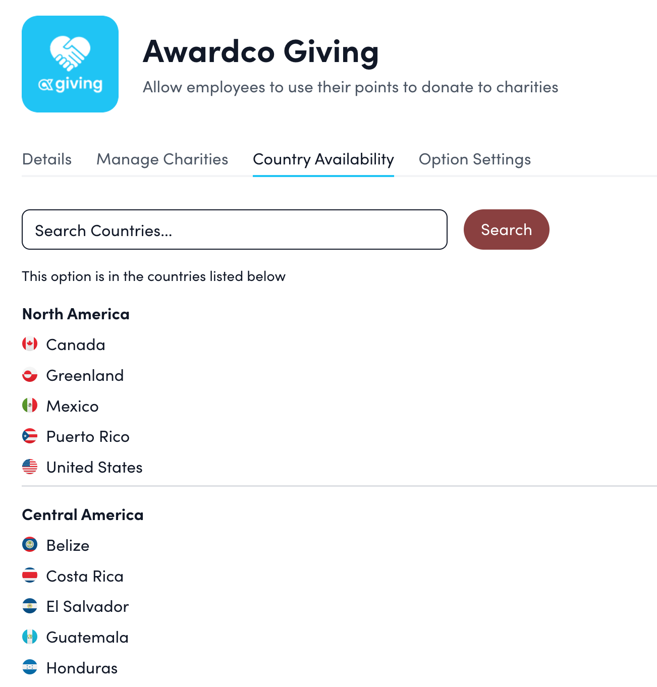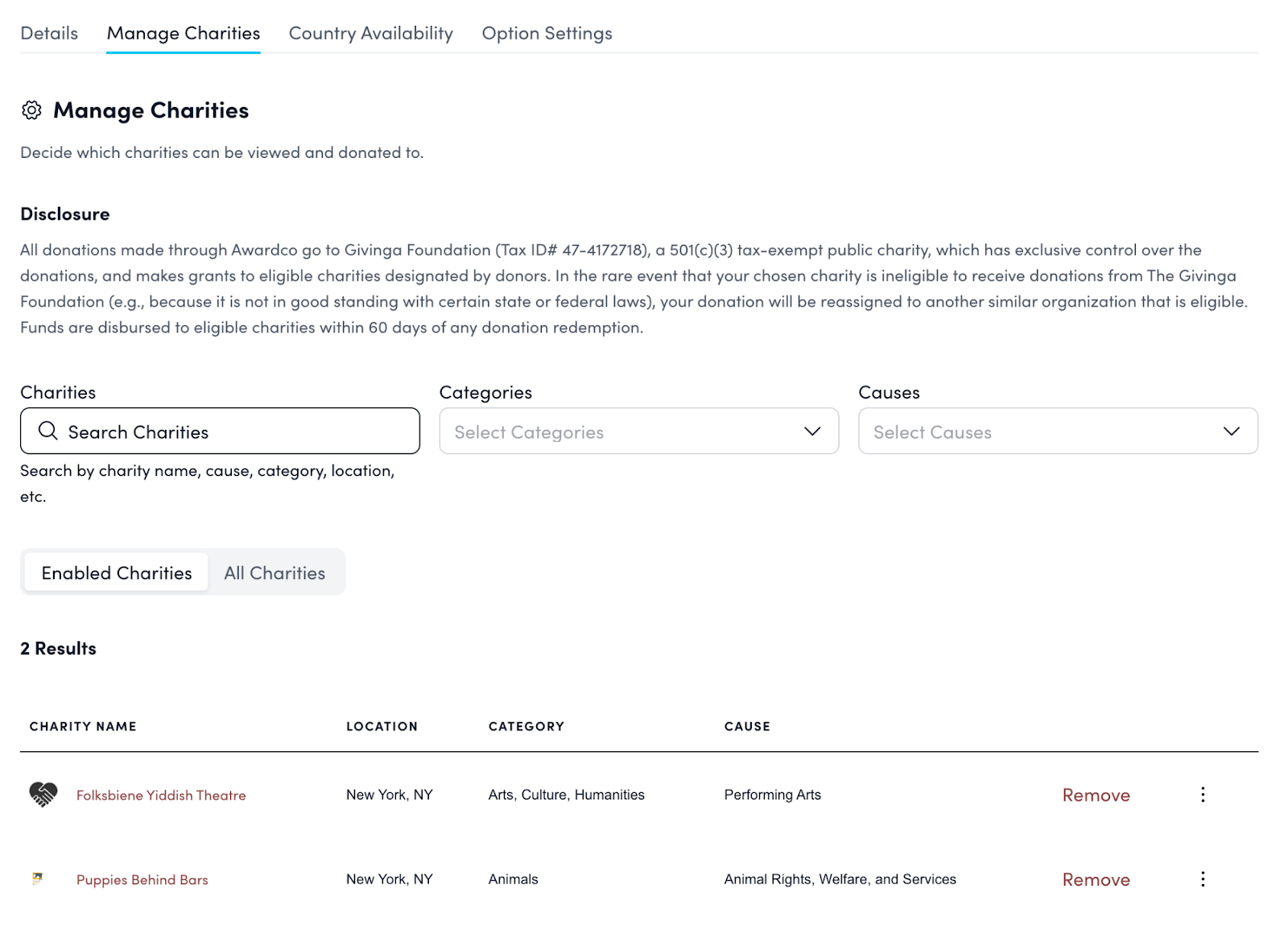 - Simplified Management: The need for manual upkeep and copying items from a master catalog is eliminated. Awardco Giving features a simplified, self-service management for adding, enabling, and removing charities.