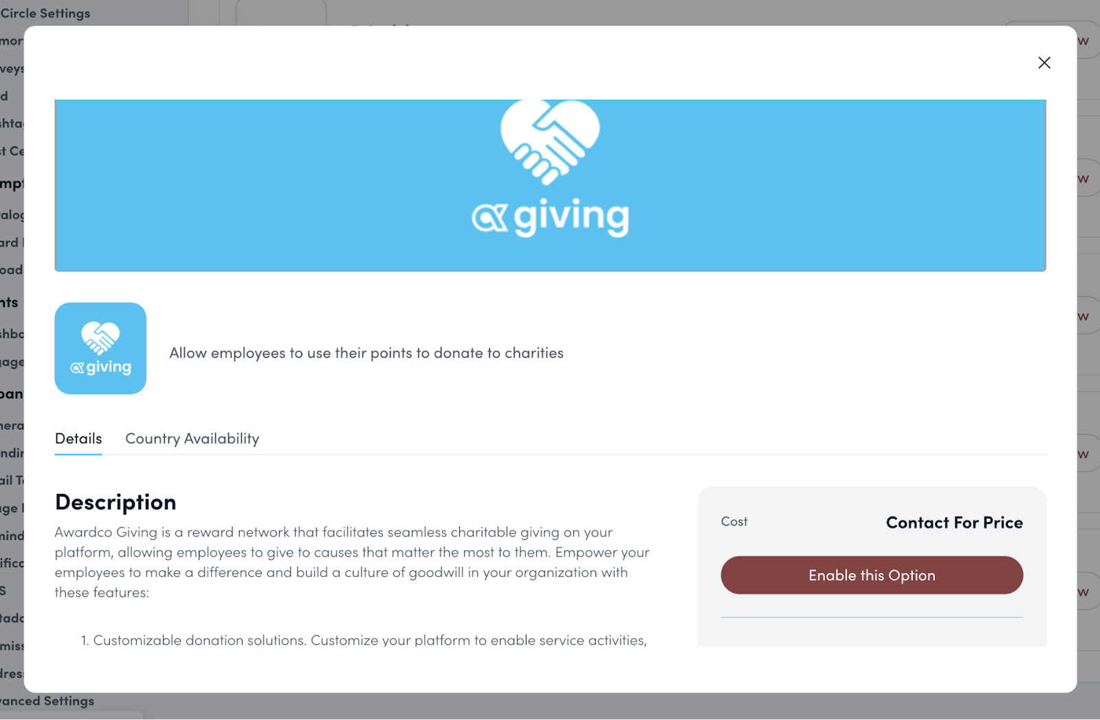 - Enable Awardco Giving as a company-wide Award Option.