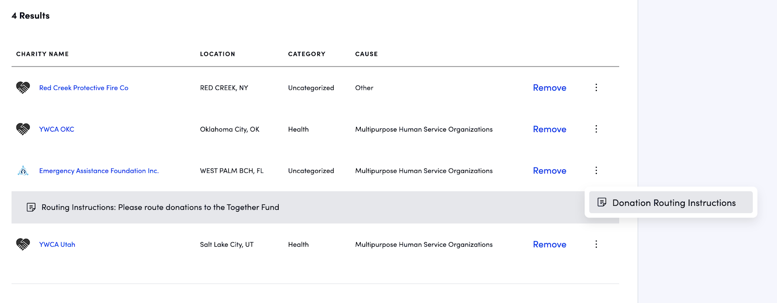 - Click the three dots next to the charity's name.