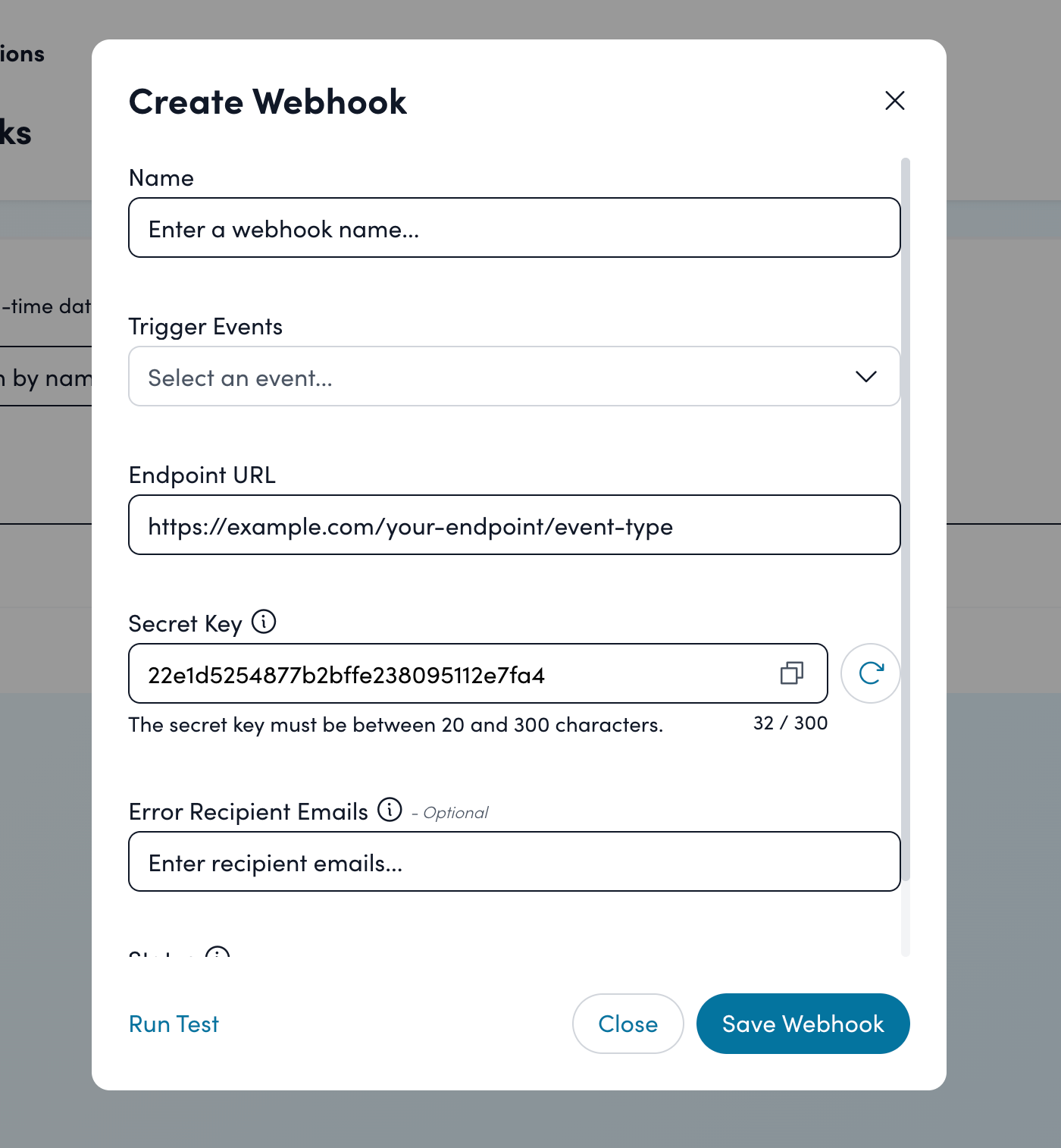 When you click "Create Webhook," a modal will appear where you can configure your new webhook. Here's a breakdown of each field: