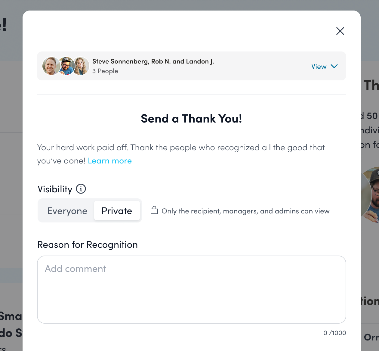 Once the user clicks "Send a Thank You," a recognition form will appear, pre-populated to thank the user(s) responsible for the points that enabled their redemption.
