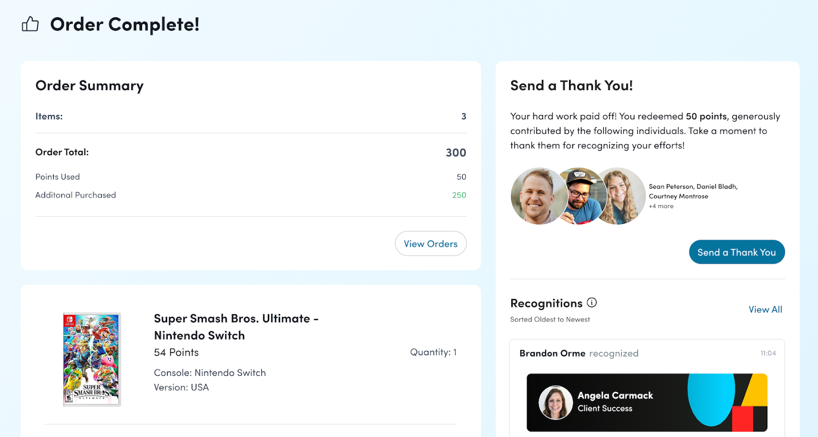 When a user completes a redemption using points they received from other users, a "Send a Thank You" prompt will automatically appear on the order completion page. This prompt displays a list of all users who contributed points towards the redemption, along with the corresponding recognitions sent with those points, presented in chronological order.