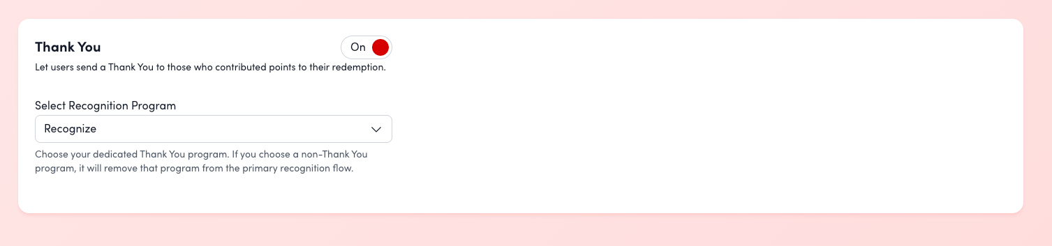 Enabling "Thank a User at Redemption" involves two main steps: creating a dedicated "Thank a User" recognition program and then activating the setting within your platform's recognition program settings.