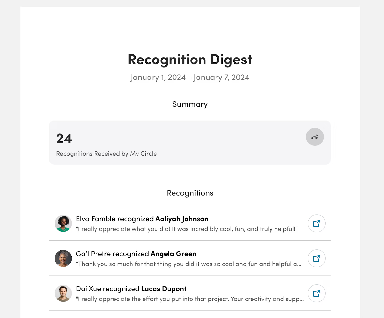 The Recognition Digest is a weekly summary email that consolidates all recognitions received by a selected group of people from the previous seven days.