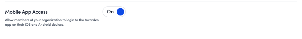 The Mobile App Access toggle determines whether users within your organization can successfully log into the application. If the toggle is set to OFF, users attempting to log in will receive a message stating that access has been restricted by their organization.