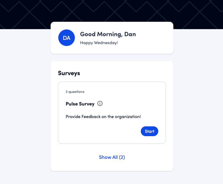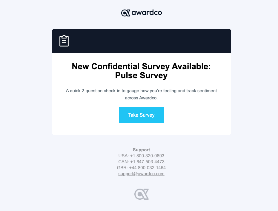 Welcome to Awardco Engage! This platform provides a space for you to share feedback and contribute to your organization's culture through surveys and employee sentiment tools. This guide will help you quickly get set up to participate in surveys and manage your account settings.