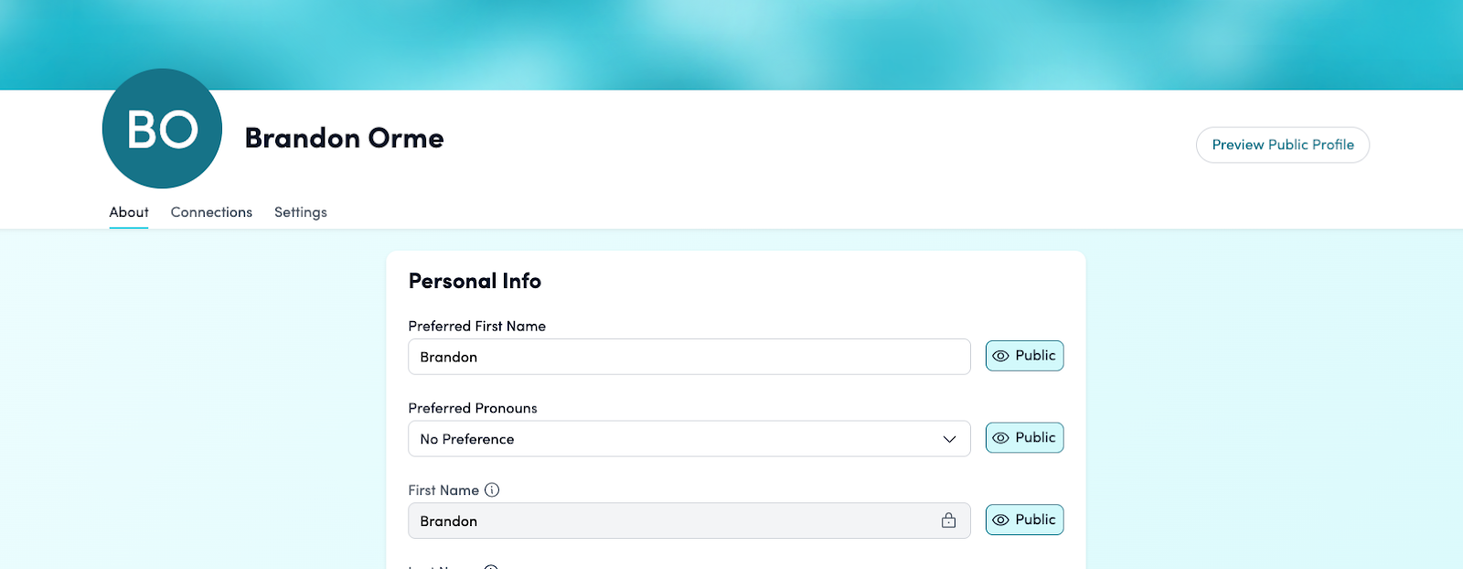 Use the About tab to update personal information (Preferred name, profile picture, etc.).