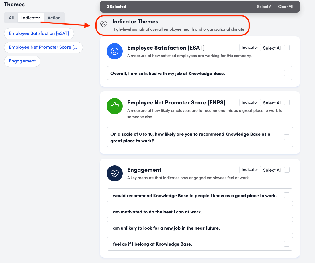 Indicator Themes: These are the 4 "Engagement" theme questions. High-level signals of overall employee health and organizational climate, indicating how engaged your employees are overall.