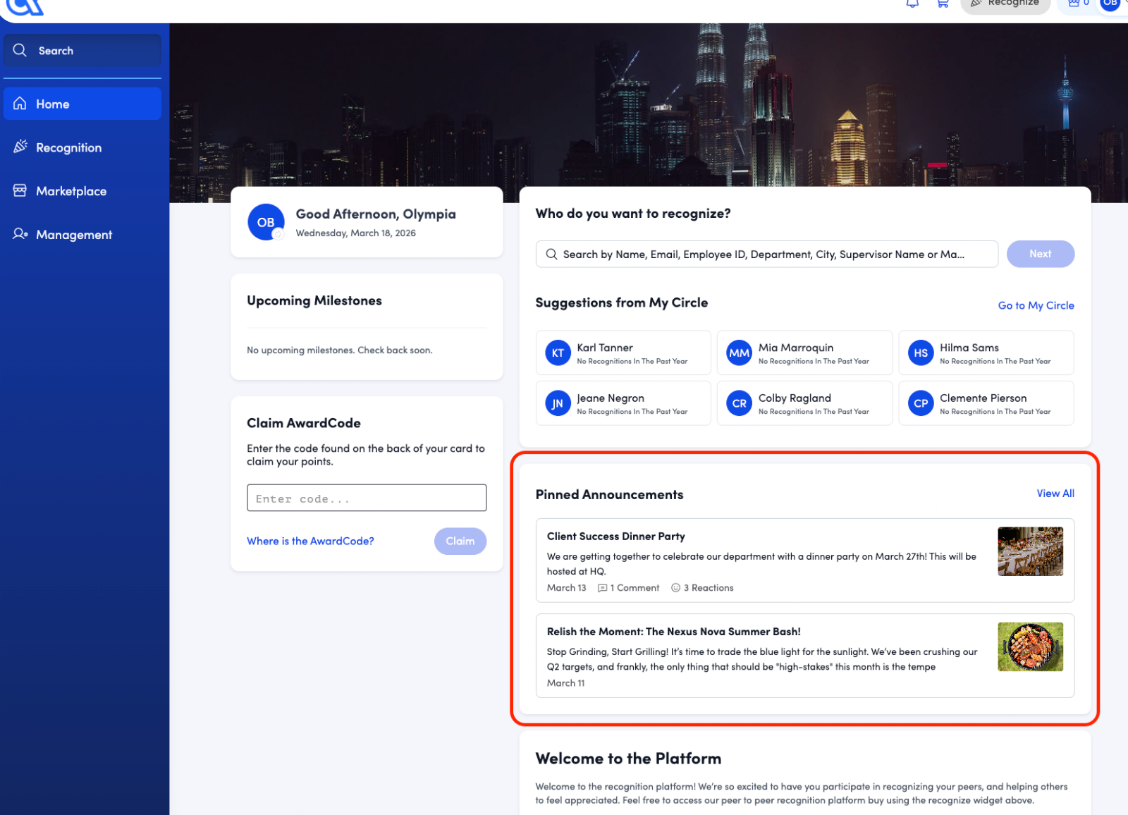 Company Announcements are a messaging tool in the Awardco platform that lets authorized users send formal updates and news to specific groups of employees through email and in‑platform messages.