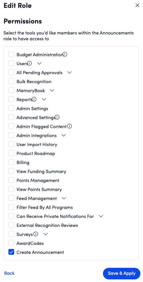 Super Admins will have access to Announcements by default. Others can be given access to create announcements in Roles and Permissions. This can be done by: