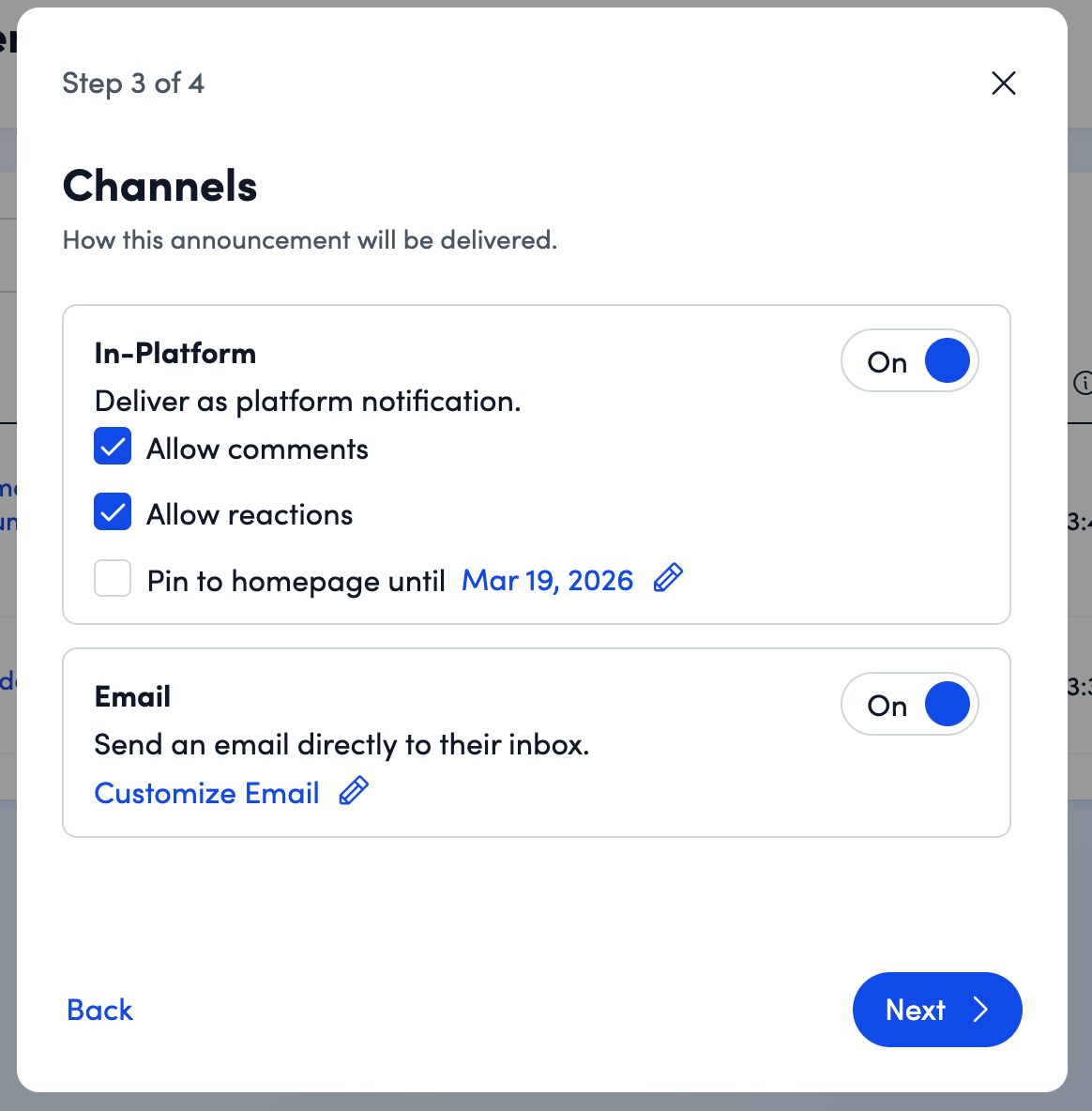 - Sharing announcements in-platform can be toggled on or off. Additionally, you can choose to: