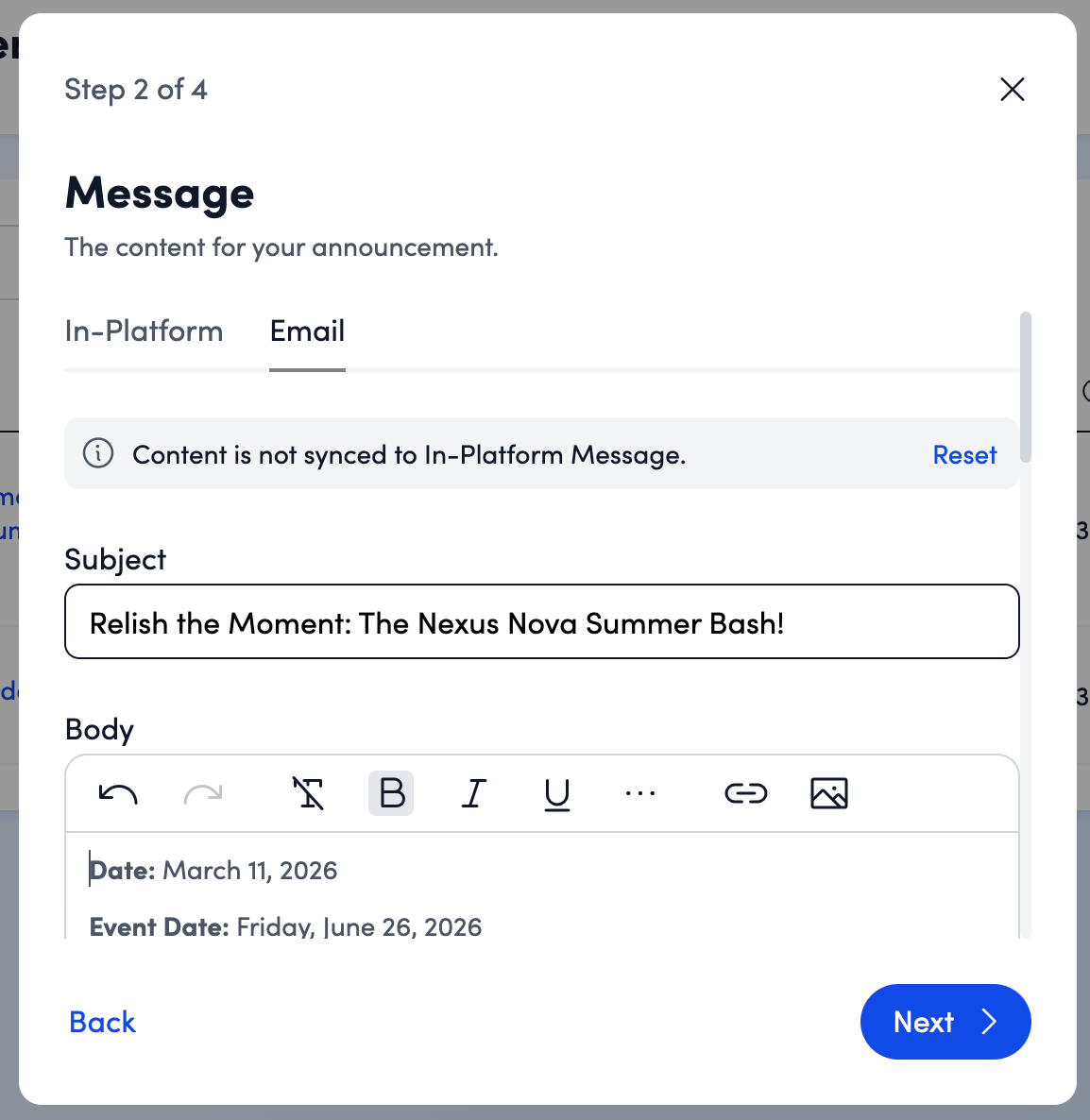 - Customize the email: The content will automatically pull from the message you created in Step 3, but you can edit it further for your email audience.