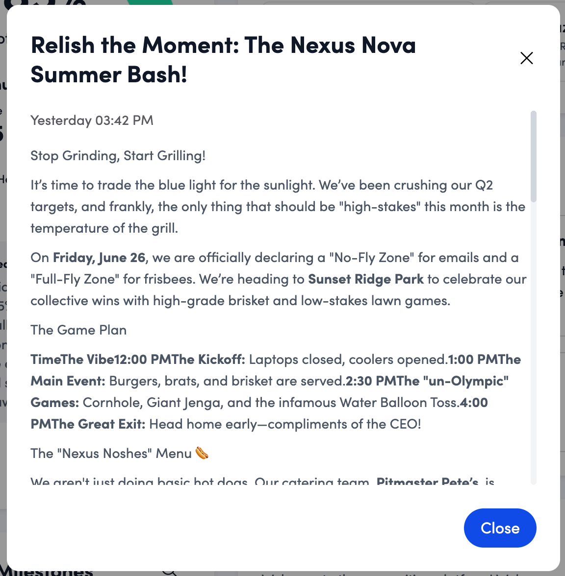 Pinned announcements appear in a dedicated homepage widget for maximum visibility. From the widget, employees can click to view the full message, images, and links in a convenient pop-up modal.