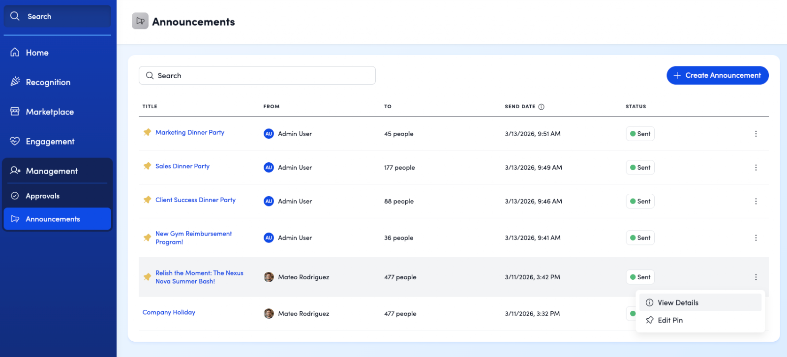 After an announcement is sent, you can review performance and adjust pin dates as needed. Use the announcements page to: