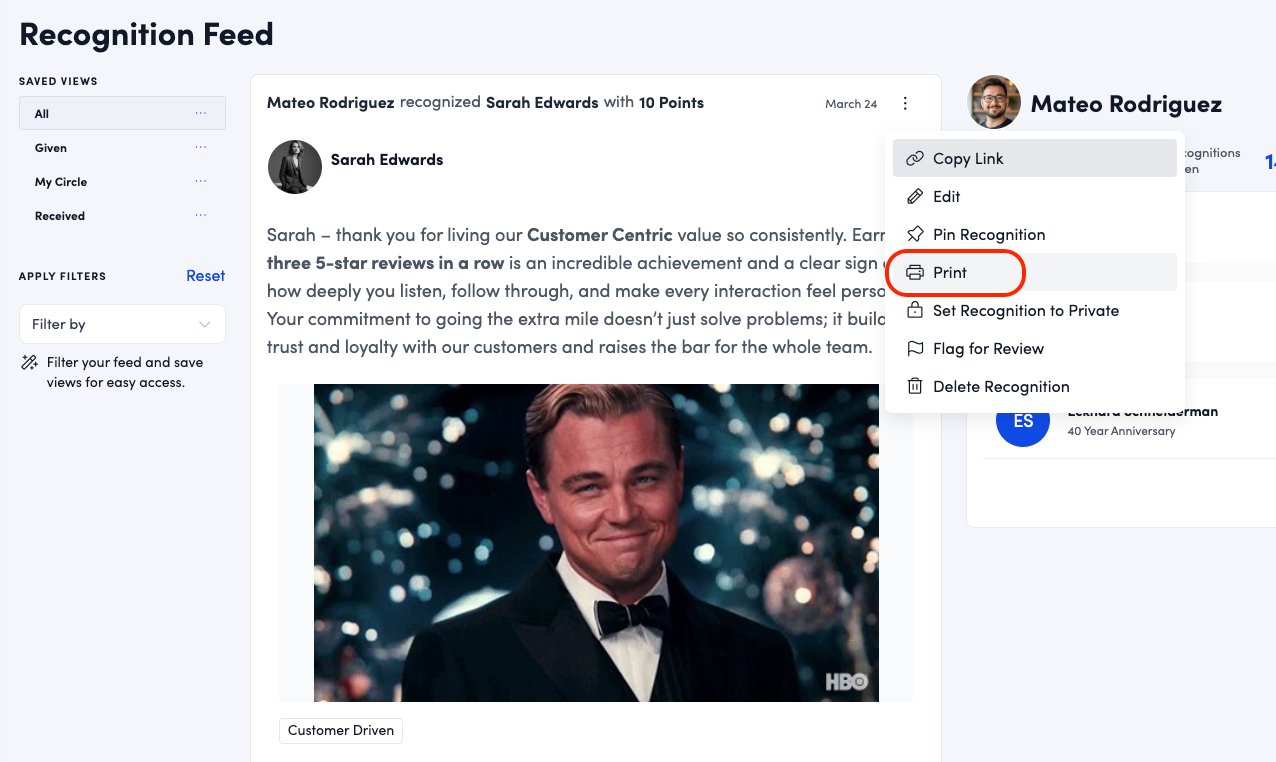 Learn how to quickly generate and print a certificate for your recognition or a coworker’s so you can easily save or share it whenever you need it.