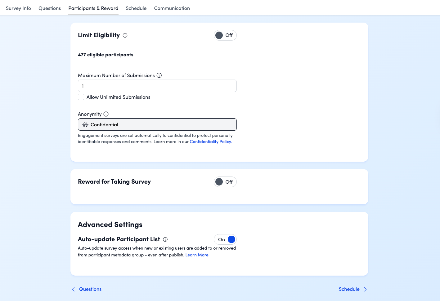 - If your survey audience is based on metadata (like department, location, or manager) or is open to “everyone”: