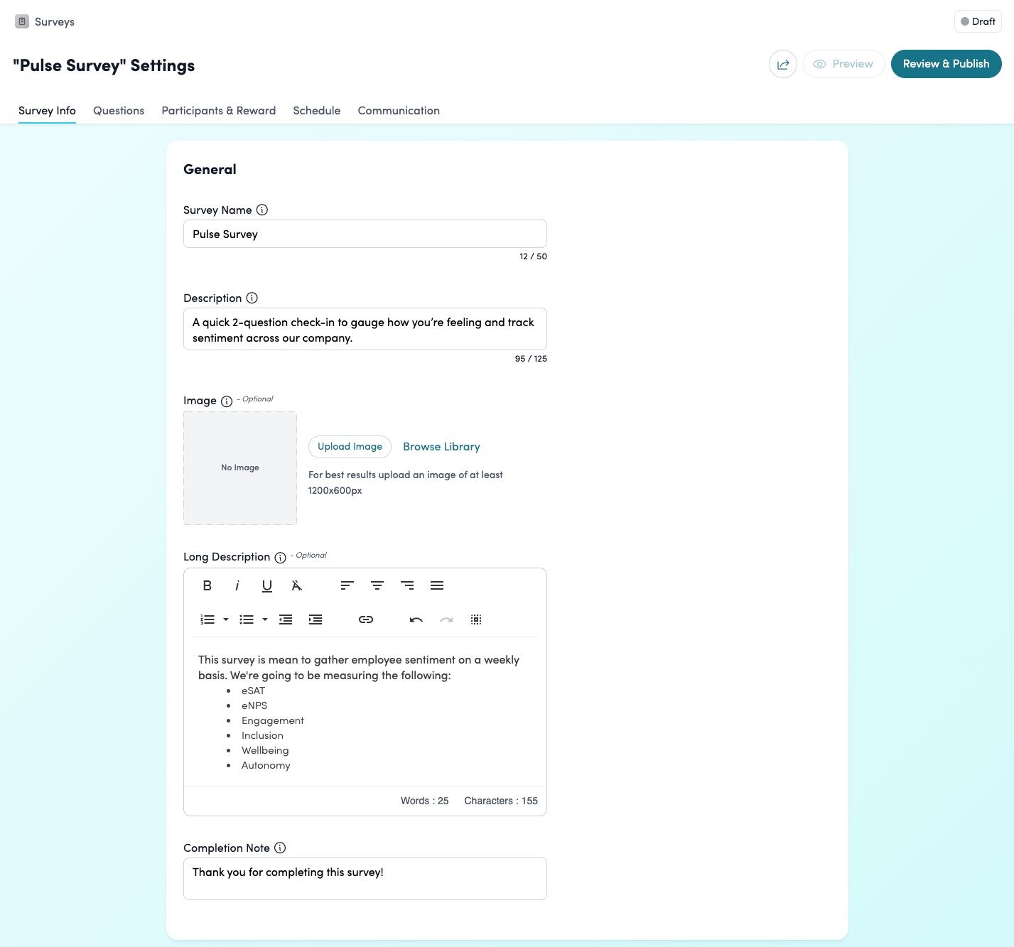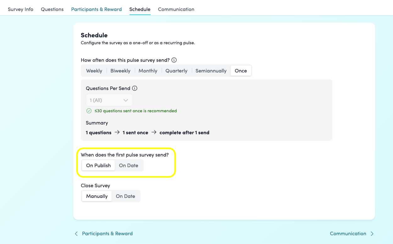 Note: Keep in mind the “Scheduled” settings you configured in the Settings tab before publishing. If you set the first engagement survey to be sent “On Publish”, the first survey will be sent as soon as you click “Review & Publish”. If you had the first engagement survey set to send on a schedule date, the first engagement survey will not send upon clicking “Review & Schedule”