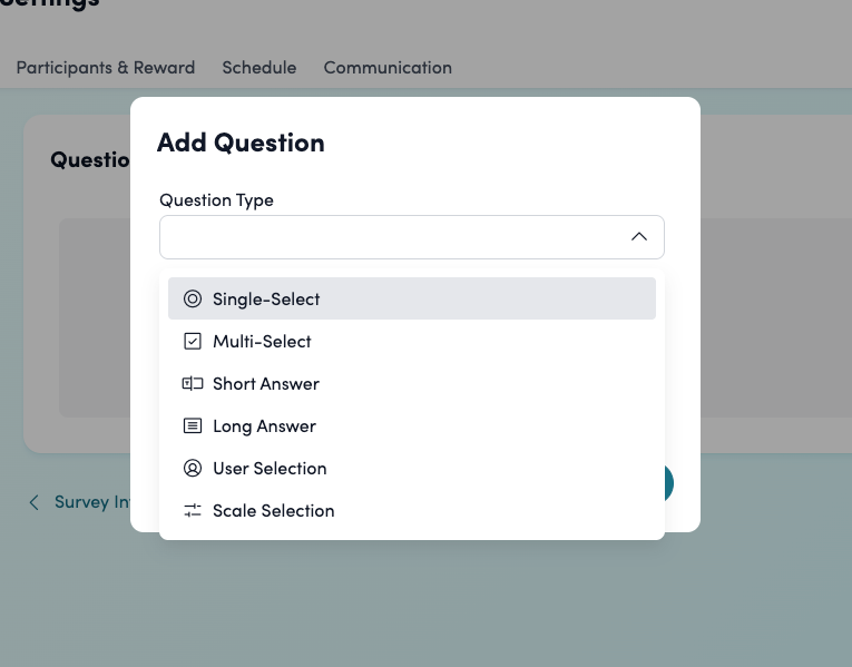 Single-Select: Similar to a multiple-choice question, a Single-Select question allows only one answer.