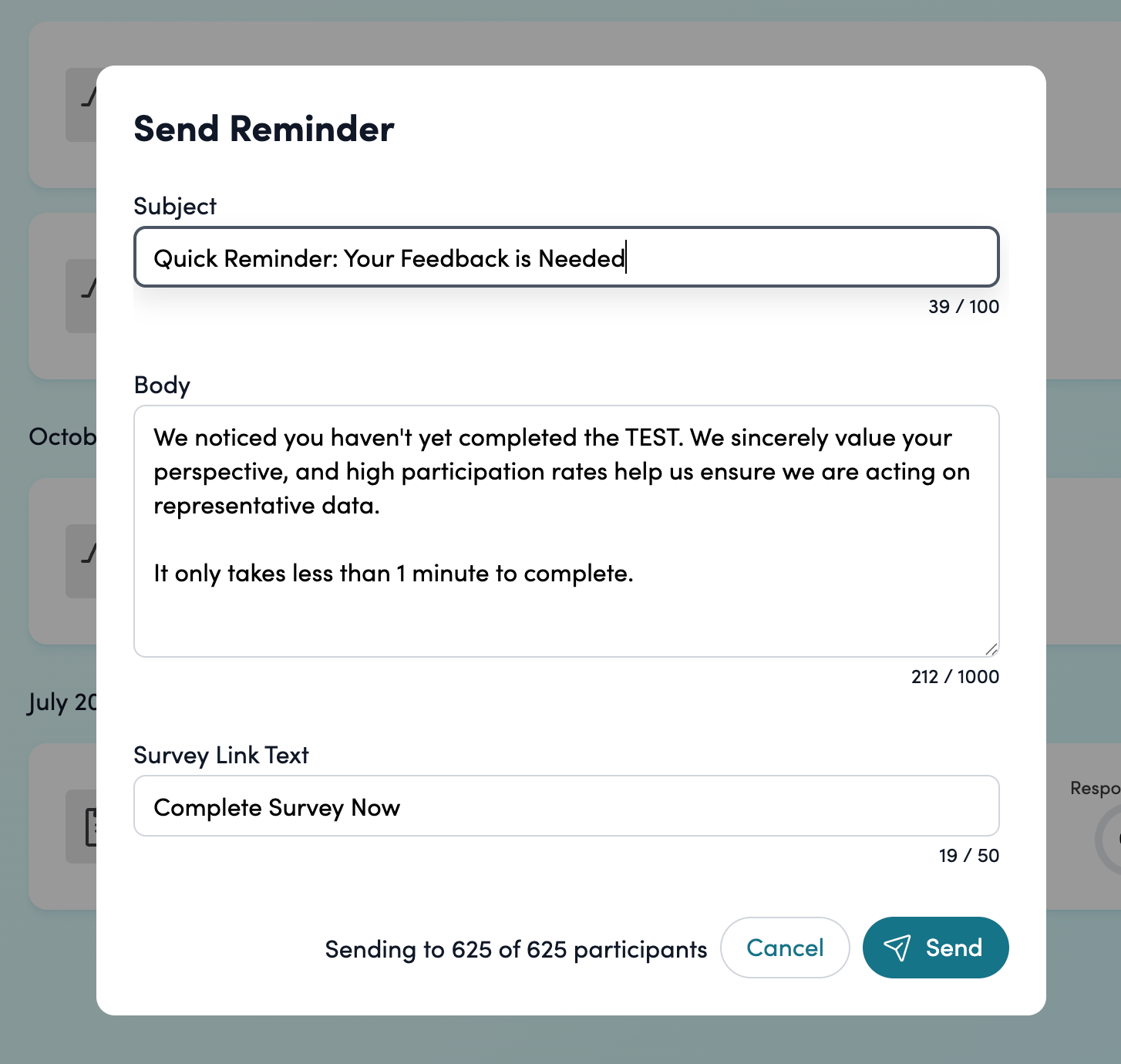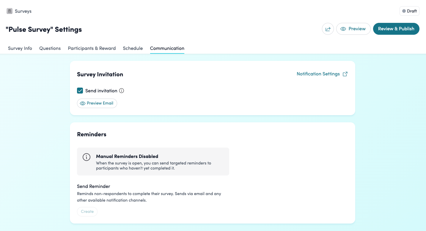 While the survey is in draft status, the option to send reminders is disabled. Once the survey is published (Open Status):