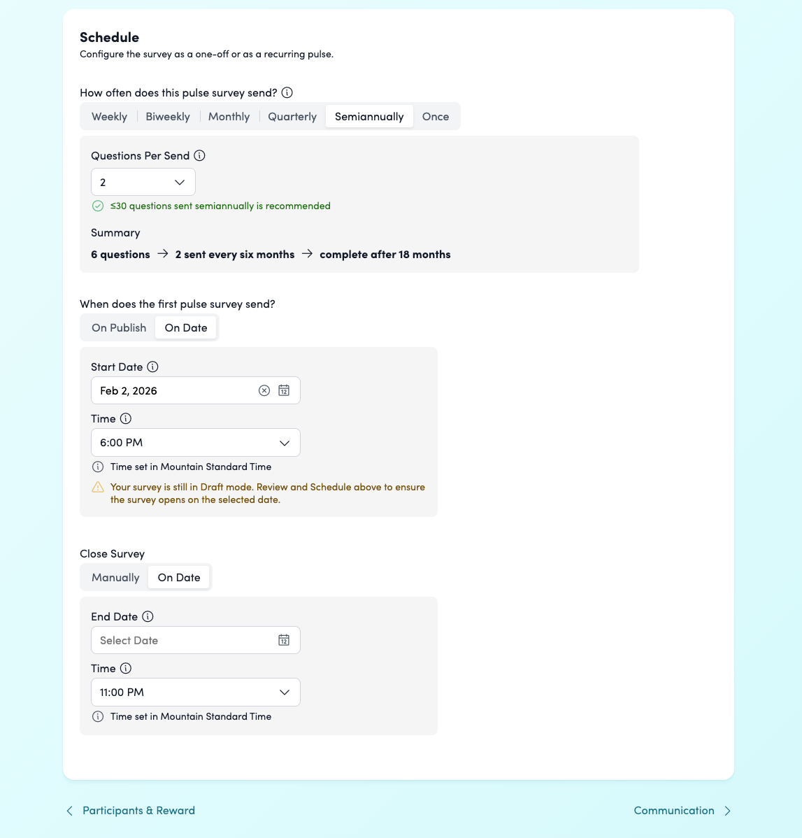 Questions per Send: If a recurring cadence is selected (not "Once"), specify the number of questions each employee will see. To prevent survey fatigue, the system automatically rotates your question pool so that all questions are asked during every pulse, but distributed across different groups of employees.