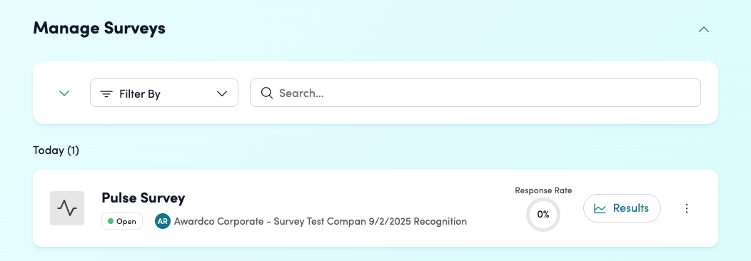 - Past Surveys: Displays surveys in "Closed" status. Response data is still accessible by clicking "Results." You can also duplicate the survey or view settings by clicking the stacked three-dot icon.