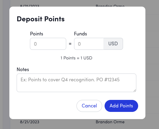 - Confirm Deposit: After completing the form, click "Add Points" and confirm the deposit.