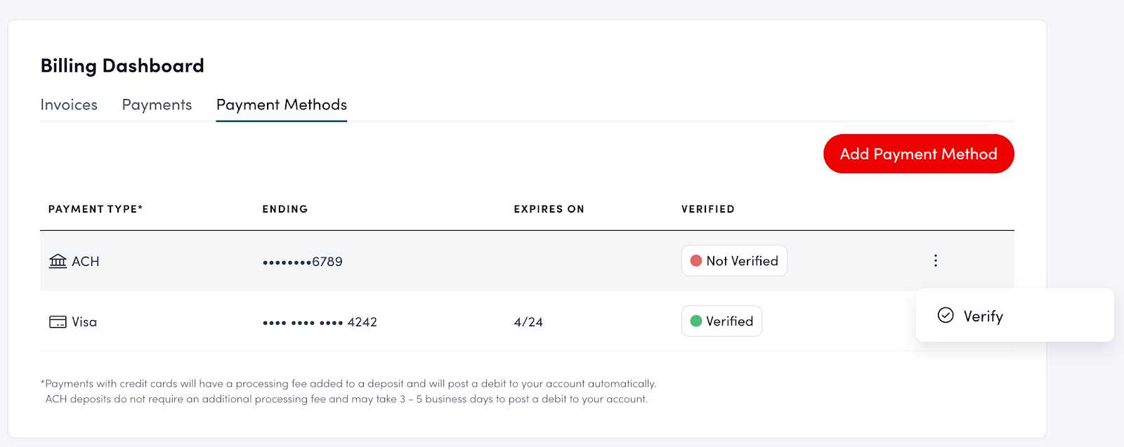 Click the three-dot icon next to the payment method and select Verify.
