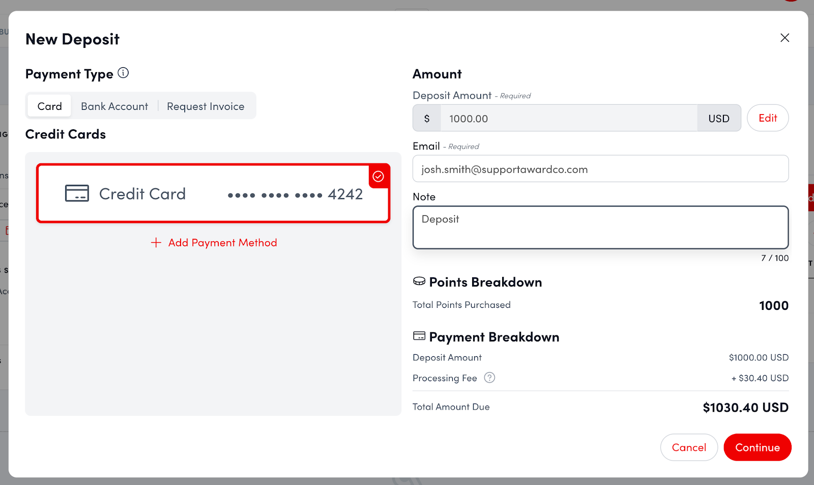 - Enter an email address for deposit confirmation and add a note detailing the reason for the deposit.