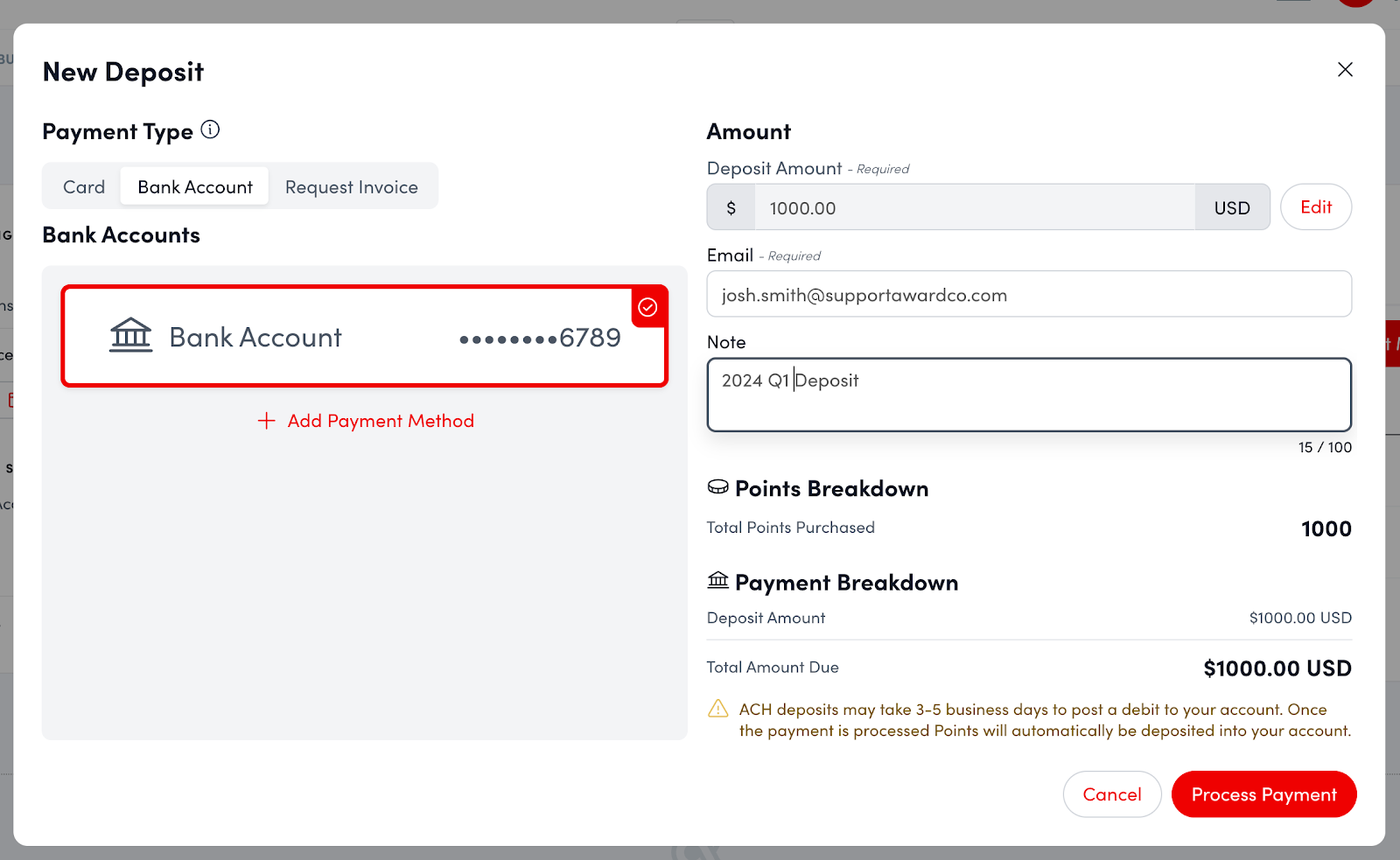 - Admins can deposit via credit card or ACH on the Billing Page ( Admin → Finance → Billing). You'll need to add and verify a payment method first.